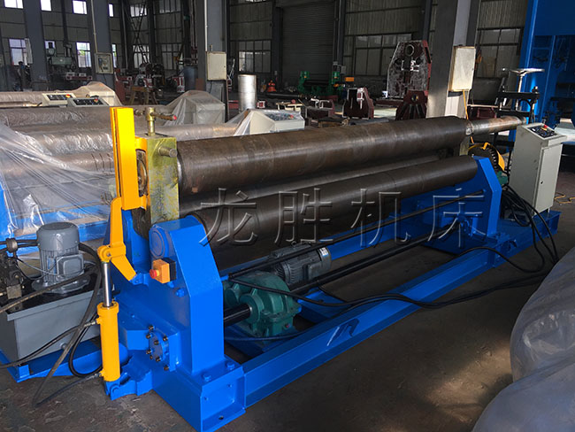 機械對稱式卷板機工作原理該機構形式為三輥對稱式,上輥在兩下輥中央對稱位置作垂直升降運動,通過絲桿絲母蝸桿傳動而獲得,兩下輥作旋轉運動,通過減速機的輸出齒輪與下輥齒輪嚙合,為卷制板材提供扭矩。
