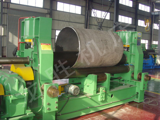 該機(jī)屬于液壓型三輥卷板機(jī),用于常溫狀態(tài)下將各種容器用碳鋼、低合金鋼一次上料后不需調(diào)頭即完成板材端部預(yù)彎、卷圓和矯圓等工序。