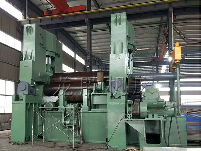 該機屬于液壓型三輥卷板機,用于常溫狀態(tài)下將各種容器用碳鋼、低合金鋼一次上料后不需調(diào)頭即完成板材端部預(yù)彎、卷圓和矯圓等工序。