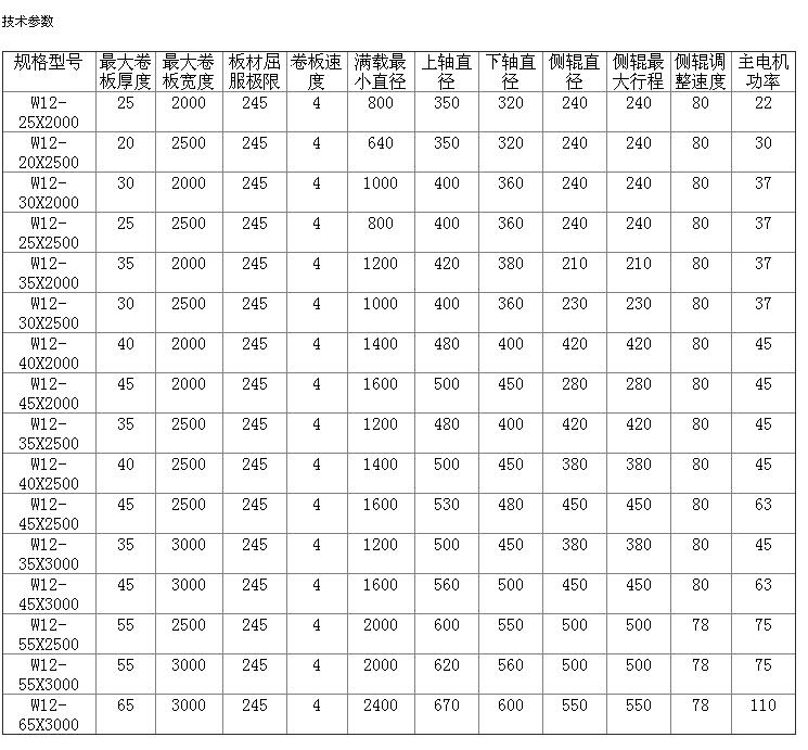 該機結構型式四輥式,上輥為主傳動,通過減速機的輸出齒輪與上輥齒輪嚙合,為卷制板材提供扭矩;下輥作垂直升降運動,通過液壓缸內的液壓油作用于活塞而獲得,以便夾緊板材,為液壓傳動;在下輥的兩側設有側輥并沿著機架導軌作傾運動,通過絲桿絲母蝸輪蝸桿傳動;該機優點是板材端部預彎及卷圓可以在同一臺設備上進行。